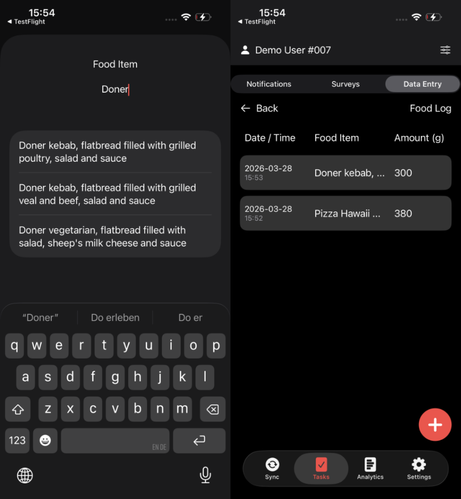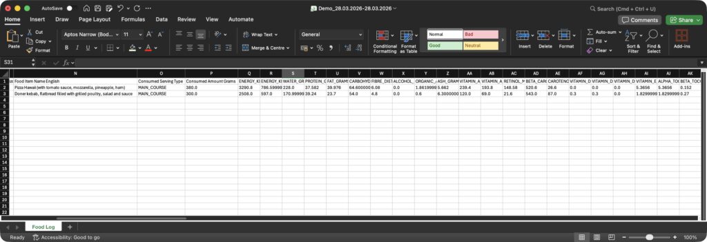 ▶︎ Unified Exports: Researchers can export combined datasets (XLS, CSV, JSON) that sync food intake timestamps with physiological raw data for advanced statistical modeling.