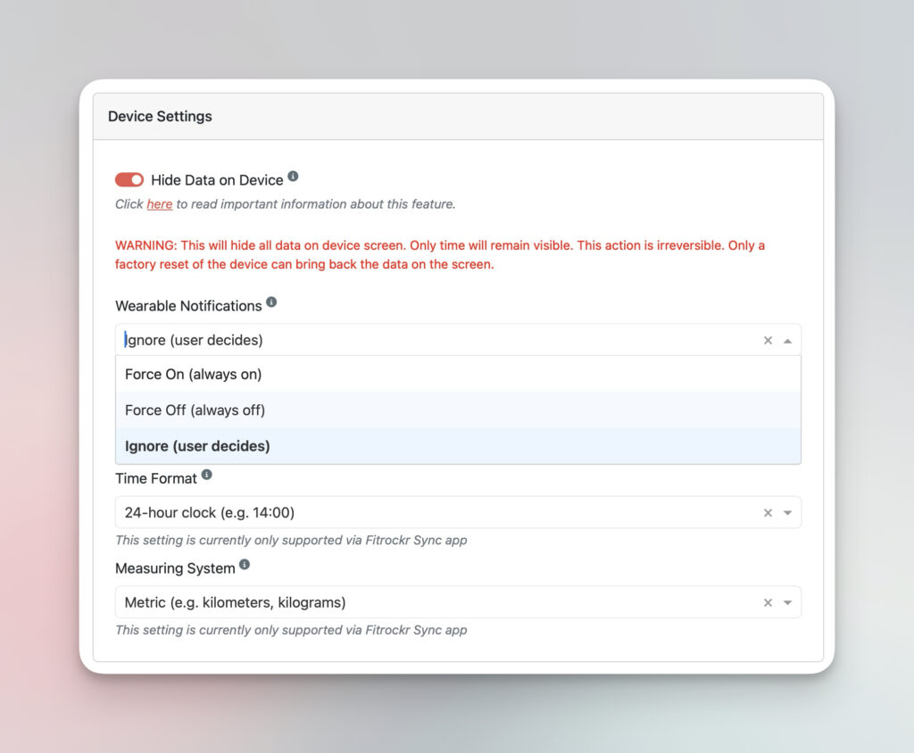 – Enable or disable Garmin device notifications directly from the Fitrockr platform