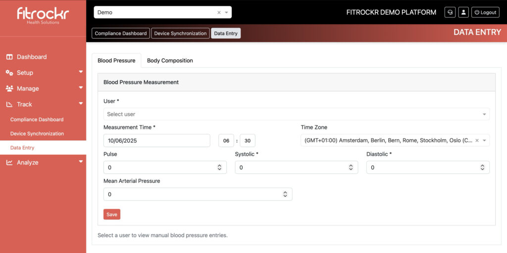 Researchers can access manual entry options via the TRACK section. The new module supports Blood Pressure and Body Composition entries and will be continuously extended. Let us know which data types you need!