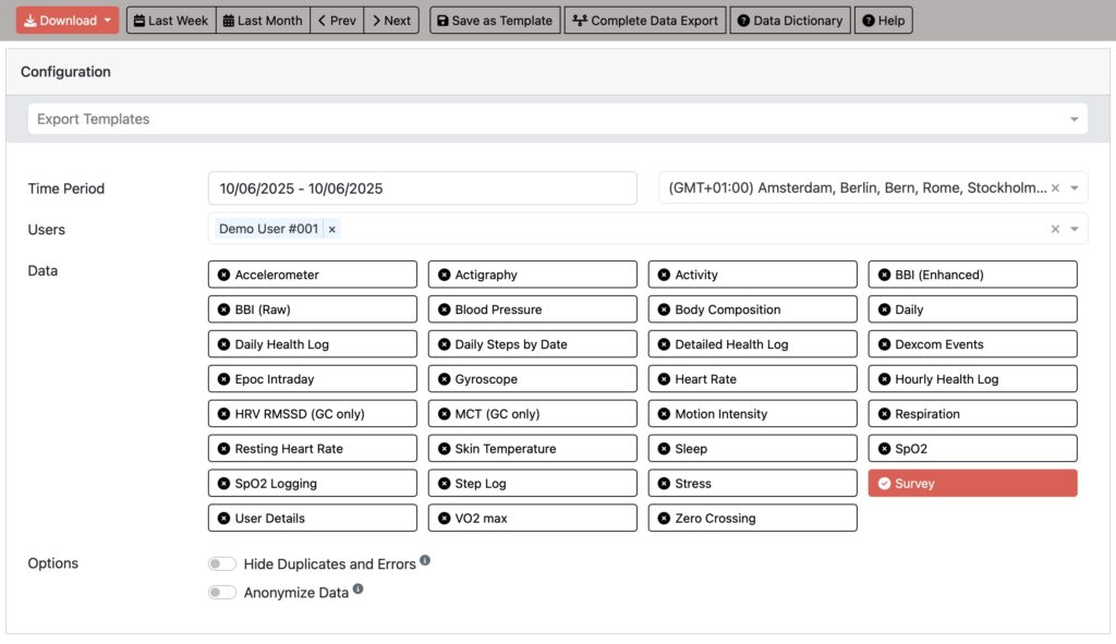 We have added a new attribute “Skin Temperature Deviation” to the Skin Temperature data type in the Data Export module. The new attribute will be provided by compatible wearables.